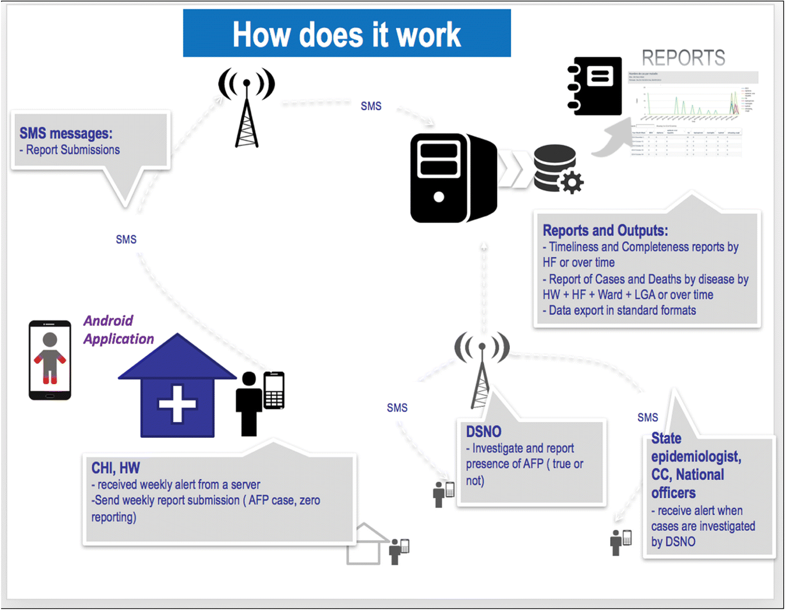 All participants were provided with mobile phones with the AVADAR App pre-installed. As a learning tool, the AVADAR App contains an embedded 30-second video of a child with symptoms of AFP, as well as a case investigation form that HWs and CHIs use to record case details of each child suspected of having AFP. At a designated day and time each week, the video appeared on the phone of study participants. Informants in the study reported suspected AFP cases on a weekly basis to a cloud-based server using the AVADAR App. Once a HW or CHI sends a suspected AFP case report, the server automatically sends a short messaging service (SMS, or text) alert to the respective DSNO's mobile phone with a summary of the suspected AFP case information. The DSNOs use a customised open data kit (ODK) application form on their mobile phones to investigate all reported AFP cases and send confirmed case details to the AVADAR server. Data are collated from the AVADAR servers and used for data analysis.