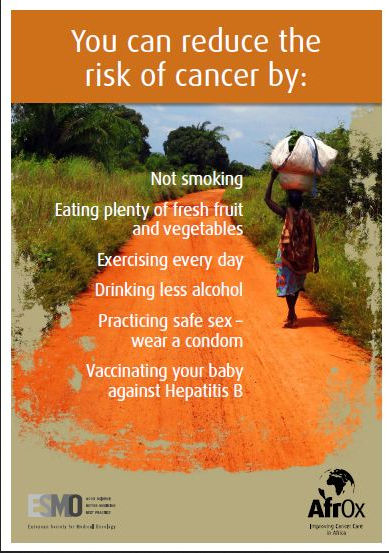This series of cancer prevention and awareness posters have been designed for use in Africa by AfrOx and the European Society for Medical Oncology (ESMO) Developing Countries Task Force. The posters were first piloted in Ghana, and have been designed with support from the Cancer Society of Ghana, clinicians, and nurses in Ghana. The goal was to develop a template for low-cost cancer awareness and prevention programmes that can be replicated in other developing countries. According to AfrOx, this poster campaign is designed to help improve people's understanding about the early signs of cancer and of how simple lifestyle changes can greatly reduce the likelihood of developing many cancers.