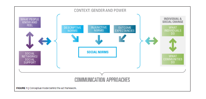Developed in this context, and as detailed at Related Summaries, below, ACT is an evidence-based framework to measure FGM behaviour and social norms change over time. ACT is an acronym for the different sections of the framework. The conceptual model (see above) behind the ACT framework is based on the premise that norms influence thoughts and behaviours and that thoughts and behaviours influence norms; if social norms change, then thought and behaviour change may ensue, and vice versa. The model incorporates a social-ecological perspective; for example, it acknowledges that what individuals know and feel are affected by, and in turn affect, their social networks and the level of social support they receive and give. The ACT framework is accompanied by conceptual definitions of key constructs that comprise social norms, the operationalisation of the key constructs, and means of verification through qualitative, quantitative, and participatory tools to measure social norms change.