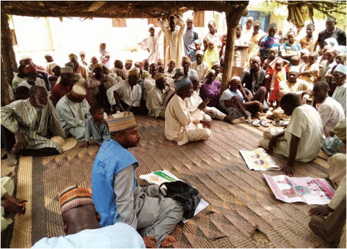 American Journal of Tropical Medicine and Hygiene, 101(Suppl 4), 2019, pp. 68-73 https://doi.org/10.4269/ajtmh.19-0143; and emails from Gena Thomas to The Communication Initiative on August 24 2022, September 8 2022, and September 14 2022. Image caption/credit: In Yobe state, Bulatura ward, the men of the Sunomari settlement convene for a community dialogue led by the coordinator for Yusufari local government area. Photo credit: Ramatu Musa Idiriss, CGPP Volunteer Ward Supervisor.