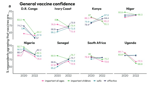 The study identifies declines in perceptions toward the importance of vaccines for children across all eight countries, with mixed trends in perceptions toward vaccine safety and effectiveness. COVID-19 vaccines are perceived to be less important and safe in 2022 than in 2020 in six of the eight countries, with the only increases in COVID-19 vaccine confidence detected in Ivory Coast. There are substantial declines in vaccine confidence in the DRC and South Africa, with the largest falls in vaccine confidence in the latter country in predominantly rural provinces, including Limpopo, Eastern Cape, and Kwazulu Natal.