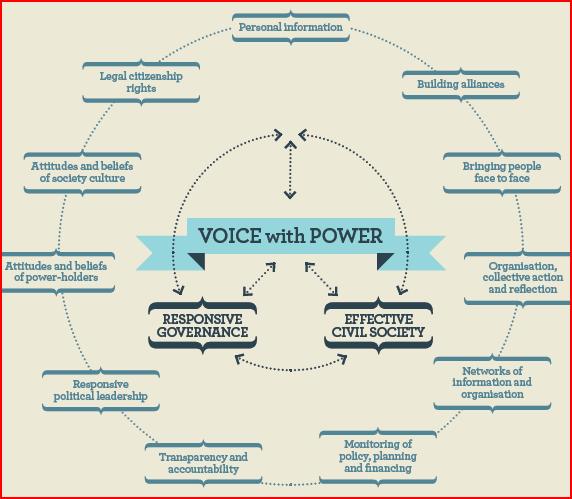 "The relationship between voice, power, citizenship and governance is complex. In order to be able to engage effectively, citizens and their communities need access to information, an understanding of power relations, skills in advocacy and negotiation, strengthened knowledge of rights, policies and practice as well as support to develop their confidence."