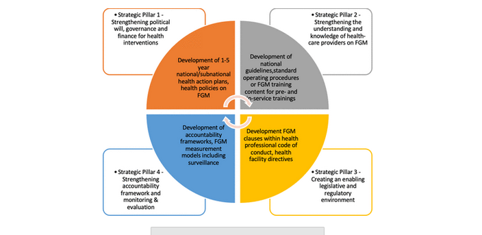 Pillars of action that guided the multicountry participatory process included: (i) strengthening the political will, governance, and funding for FGM-related health sector interventions; (ii) increasing the understanding and knowledge of health workers on FGM; (iii) creating an enabling legislative and regulatory environment; and (iv) strengthening monitoring, evaluation, and accountability. The 3-step process was composed of annual cycles where ministries of health and health stakeholders from priority countries developed comprehensive national action plans, implemented prioritised foundational activities using 8 WHO resources, and shared learning with other countries.