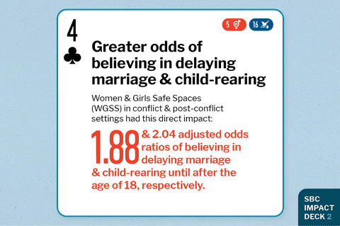 3 evaluations demonstrated moderate improvements in psychosocial well-being, social support, and attitudes toward rites of passage. For instance, safe space participants in one study exhibited greater odds of believing in delaying marriage and child-rearing until after the age of 18 (adjusted odds ratio [aORs] of 1.88 and 2.04, respectively). Girls who participated reported one additional year for the highest grade of school a participant believes should be completed versus those who did not participate. Among those married or living with someone as if married, girls in the treatment arm were 43% less likely to be married at the end of the programme compared to those in the control arm.