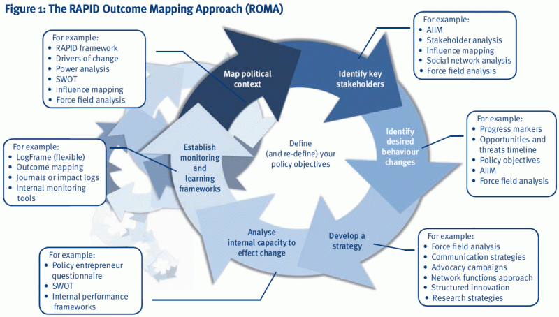 The RAPID Outcome Mapping Approach (ROMA) draws on concepts of complexity, on outcome mapping tools developed by the International Development Research Centre (IDRC) and tools for policy engagement assembled and developed by RAPID, field tested through more than 40 workshops and training courses worldwide. The eight steps of the approach are outlined below and detailed within the source document. ROMA is designed so that each step systematically provides the policy entrepreneur with more information about the context s/he is working in so that s/he will be able to make better strategic choices (and be better placed to take advantage of unexpected policy windows and opportunities for change), though not all steps might be needed in all situations.