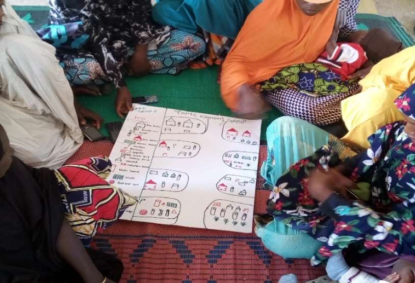 Specifically, from November 2019 to March 2020, the researchers conducted 12 rounds of CCs with 320 caregivers of under-5 children in 6 administrative wards in Kiyawa Local Government Area (LGA), Jigawa state. Conversations were structured around participatory learning and action activities, using drawings and discussion to reduce barriers to entry. During activities, participants were placed in subgroups: younger women (18-30 years of age), older women (31-49 years), and men (18 years above). Discussions were conducted over three 2-hour sessions, facilitated by community researchers. Following an initial analysis to extract priority issues and perspectives on intervention structure, smaller focus group discussions were completed with participants in 5 new sites. A sample activity: community mapping, which began with a process of identifying landmarks and resources in relation to child health but expanded beyond this to enquire about how different groups make use of this space based on dynamics such as social identity processes, communities of practice and action, and symbolic communities.