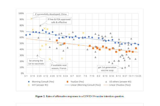The review found substantial variations in COVID-19 vaccine receptivity between countries, states within the US, and subgroups. Among US surveys, the highest intended acceptance of 72% was reported by in early April 2020; in mid-October, the propensity dropped to its lowest at 48% (men 55%, women 42%). Some Asian countries had higher acceptance: 88.6-91.3% in China and 79.8% in South Korea, both of which also reported higher trust in central governments. Other highly receptive countries included Brazil (85.36%), South Africa (81.58%), Denmark (80%), and the United Kingdom (79%); Russia had the lowest (54.9%), followed by France (58.9-62%), which also reported the largest rate of "unsure" responses (28%).