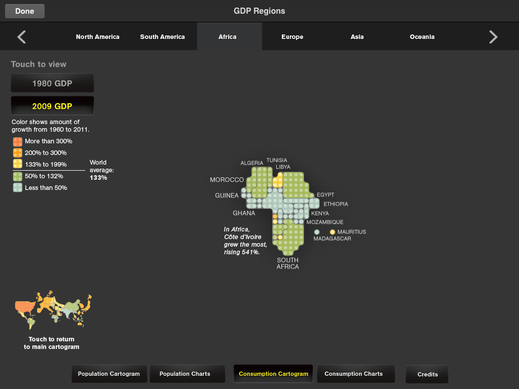 The National Geographic map with this data is relative. The greater a country's economic growth level the larger it appears on the map. My own very small country physically, New Zealand, is a heck of a lot bigger in this map. The USA, Western Europe and Japan are massive.