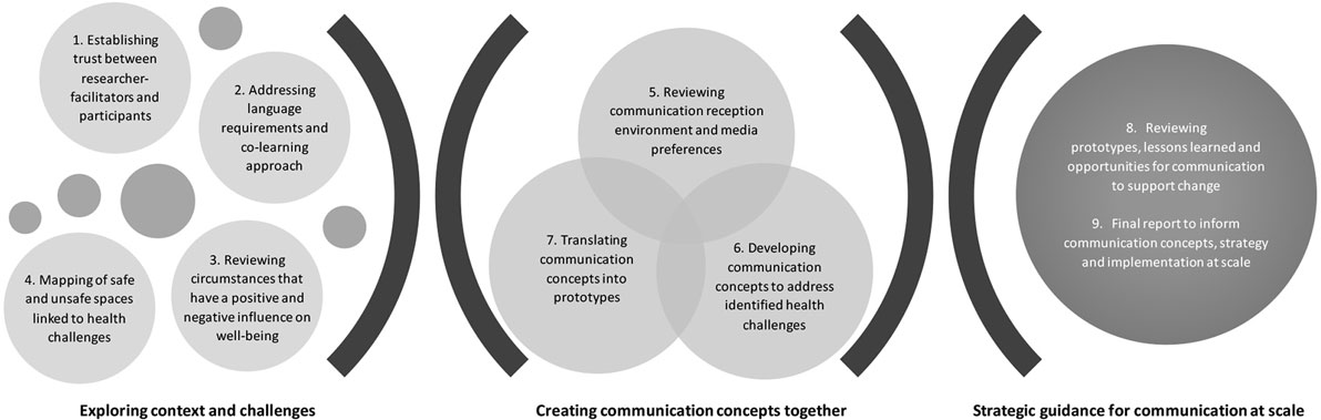 In summary, processes include (1) introductory exercises to acquaint participants and facilitator-researchers with each other and to foster trust; (2) sharing proposed formats of interaction and co-learning, languages of preference and translation, and addressing ethical concerns including freedom of expression, mutual respect, and confidentiality; (3) review of the context and circumstances of participants lives, including aspects that have a positive and negative influence on well-being; (4) a community-mapping exercise exploring safe and unsafe spaces related to health; (5) review of the communication reception environment and media preferences, including folk media; (6) engaging with slogans, proverbs, phrases, songs, and other communication concepts relevant to addressing health challenges; (7) translation of communication concepts into prototypes; (8) reviewing prototypes, lessons learned, and opportunities for communication to support change; (9) compiling a final report to inform communication concepts, strategy, and implementation at scale.