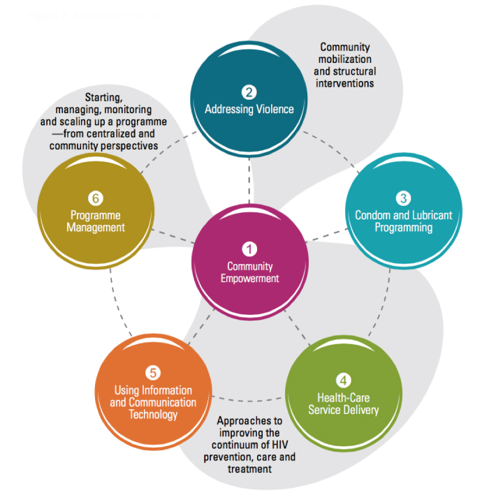 The first 2 chapters describe approaches and principles to building programmes that are led by MSM. Explicitly or implicitly addressing the 2011 Guidelines for HIV and STI Prevention and Treatment Among MSM or the 2014 Consolidated Guidelines for Key Populations, chapters 3, 4, and 5 describe approaches to implementing recommended interventions for HIV prevention, care, and treatment. Chapter 6 describes how to manage programmes and build the capacity of organisations of MSM. (See Figure 2.). More specifically: