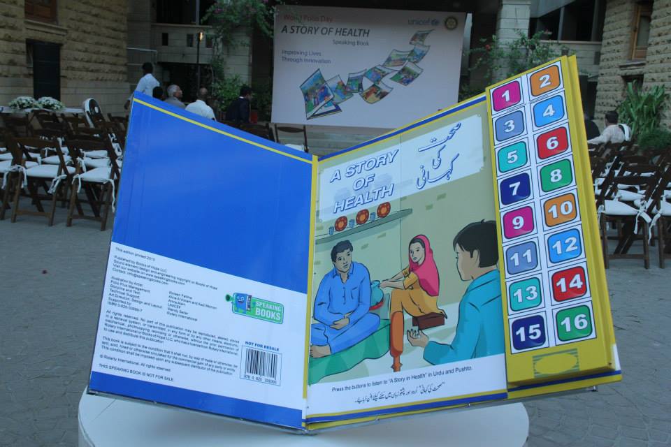 Facebook post: Rotary and UNICEF launch a speaking book "A Story of Health" and "Rotary and UNICEF Launch a Speaking Book to Prevent the Spread of Polio on World Polio Day" - both accessed on February 6 2014; emails from Alina A. Visram and Brian Julius to The Communication Initiative on February 11 2014; and email from Speaking Books to The Communication Initiative on December 2 2015.